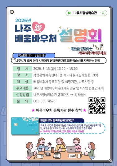 나주시는 오는 13일 오후 1시 복합문화체육센터 1층 세미나실1(빛가람동 199)에서 ‘2026년 나주애(愛) 배움바우처 설명회’를 개최한다고 6일 밝혔다.