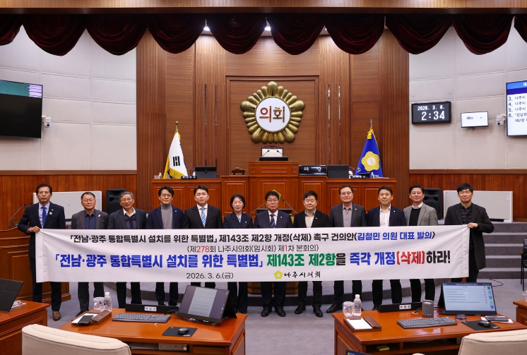 [제일경제신문]나주시의회는 3월 6일 제278회 임시회 제1차 본회의를 열고 ''전남광주통합특별시 설치를 위한 특별법' 제143조 제2항 삭제 촉구 건의안'을 채택했다.