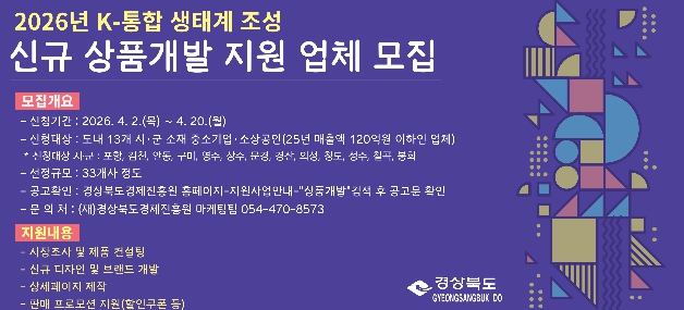 [제일경제신문] 경상북도는 도내 유망 중소기업·소상공인의 제품 경쟁력 강화를 위해 ‘2026년 K-통합 마케팅 생태계 조성사업’의 일환으로 상품 기획부터 디자인·마케팅까지 전 과정을 지원하는‘신규 상품개발 지원사업’에 참여할 기업을 모집한다.