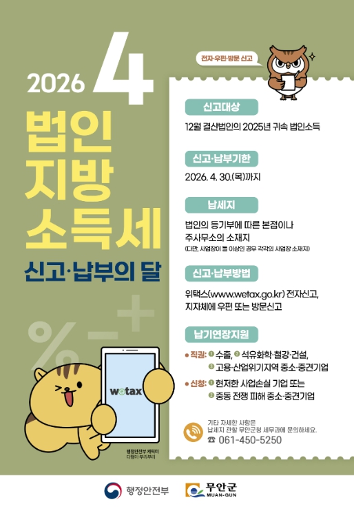 무안군, 4월 법인지방소득세 집중신고기간 운영