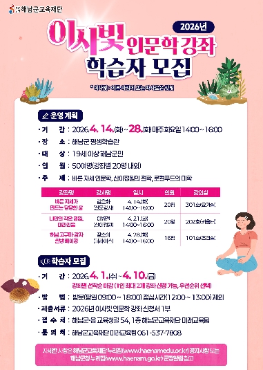 [제일경제신문]해남군교육재단은 4월 14일부터 28일까지‘해남 이사빛 인문학 강좌’를 운영한다.‘이사빛’은‘이른 아침 따스하게 비추는 햇빛’을 의미하며 따뜻하고 친근한 인문학의 빛을 전하는 군민 교육과정이다.