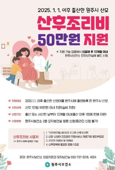 [제일경제신문]원주시는 2025년부터 출산 또는 사산한 산모의 산후 회복과 경제적 부담을 덜어주기 위해 산후조리비를 지원하고 있다.