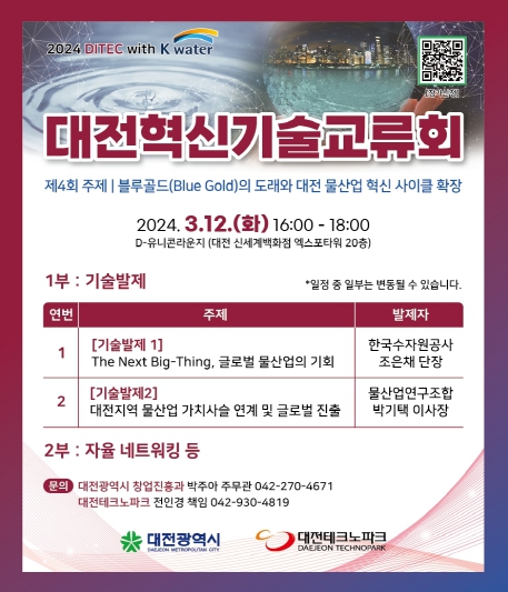 [제일경제신문] 대전시가 대표 기술교류 네트워크 ‘대전혁신기술교류회(DITEC)’에 블루골드 시대를 선도하는 한국수자원공사를 초대했다.